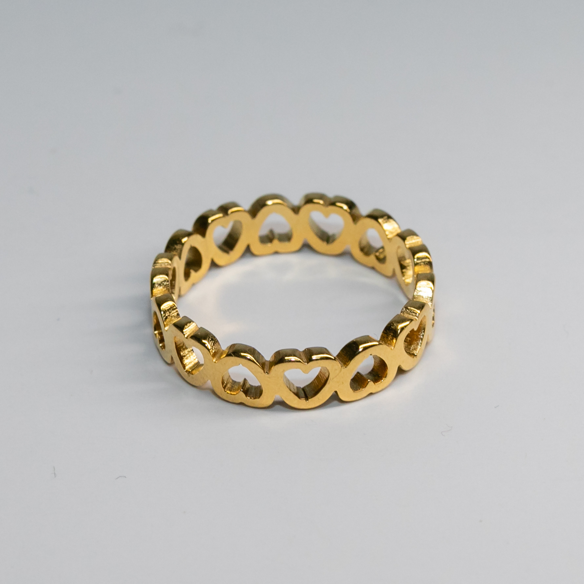 A golden band of open hearts symbolizing love and connection. With its soft shine and delicate cutout design, this ring brings a romantic yet modern charm to any look — perfect for stacking or wearing solo.