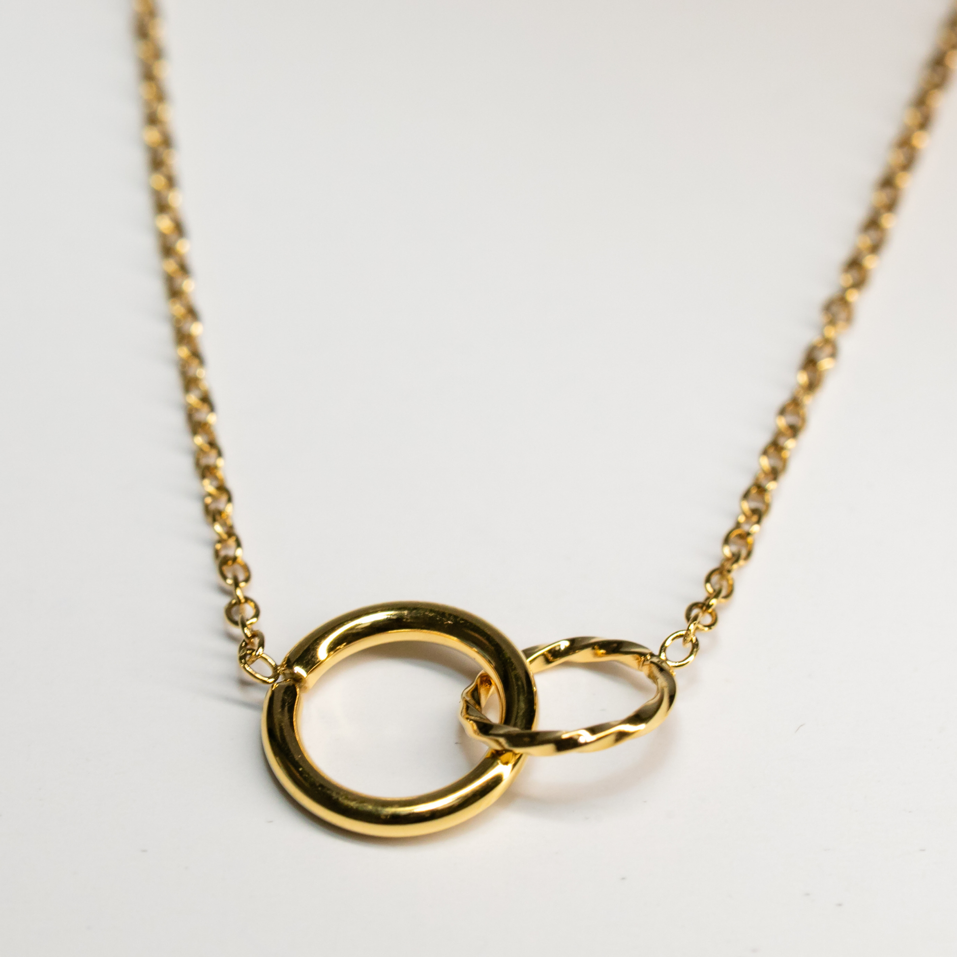 Delicate and symbolic, this gold necklace features two interlocking circles, a timeless emblem of connection and harmony. The sleek design adds a subtle sparkle and sophistication to any neckline.