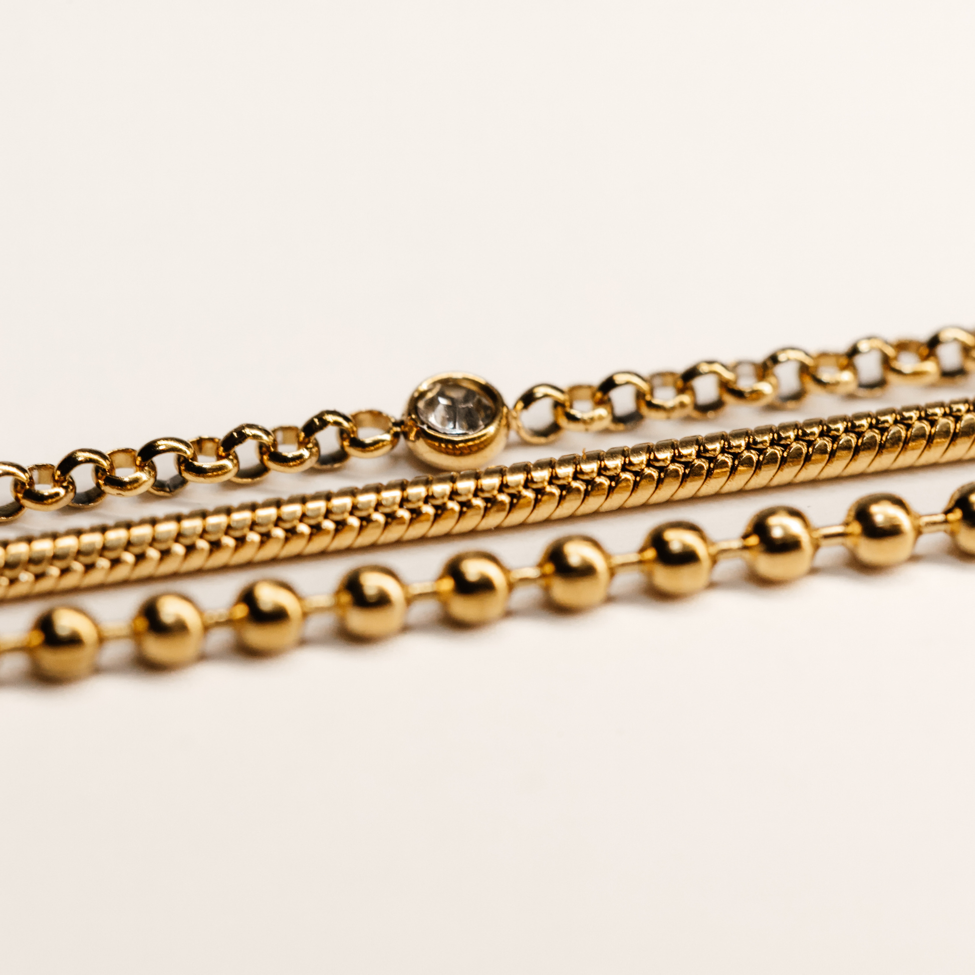 A luminous gold bracelet designed with layered strands of fine chains and tiny crystal accents. The mix of textures and subtle sparkle creates a refined statement — ideal for both everyday sophistication and evening elegance.