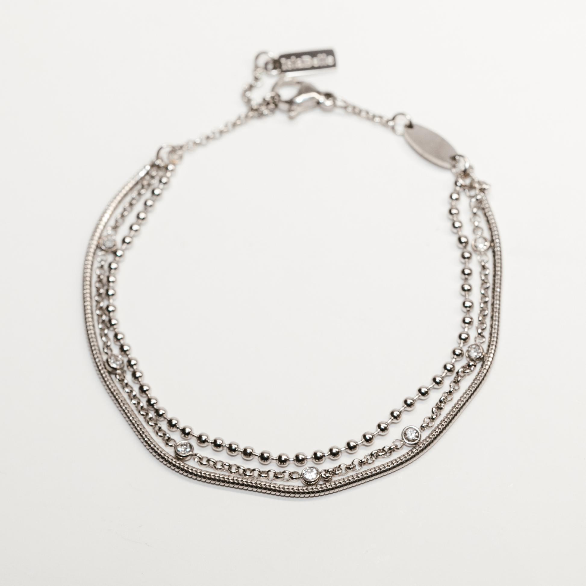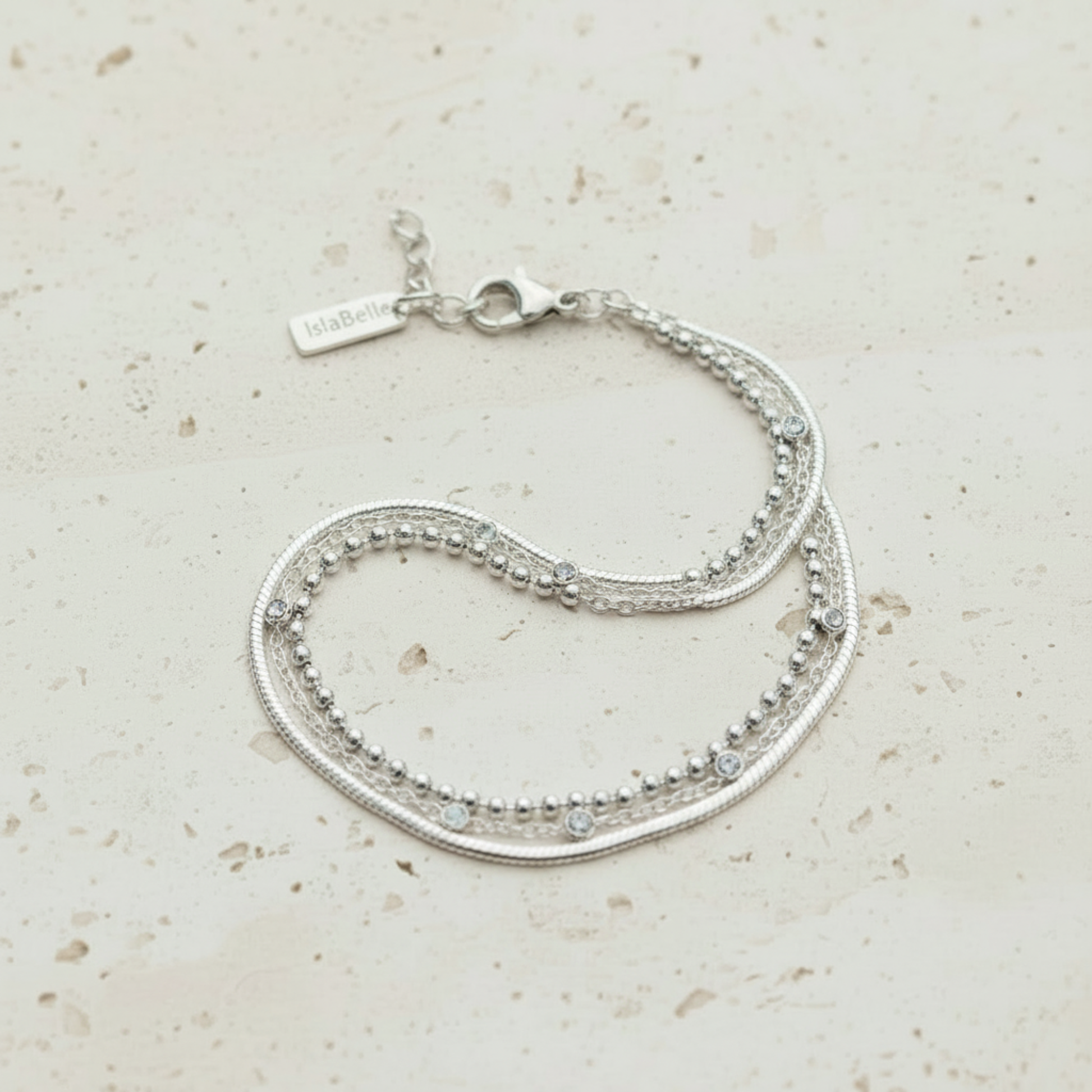 Graceful and radiant, this silver bracelet features layered chains intertwined with delicate crystal details. Its soft shimmer and fluid movement reflect light beautifully, bringing a touch of refined sparkle to both casual and evening looks.